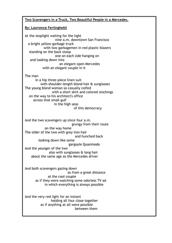 Year 10 summer task exploring the poem two scavengers in a truck, two beautiful people in a mercedes by lawrence ferlenghetti.