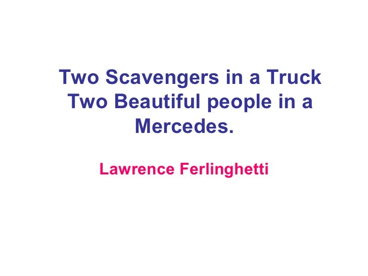 The two poems i am comparing are 'two scavengers in a truck, two beautiful people in a mercedes', written by lawrence ferlinghetti, which shows the contrast between rich and poor in san. The scavengers are hyenas, vultures, a rouge lion or two, leopards, insects, and many other animals. Ferlinghetti challenges this idea through his writing in two scavengers in a truck, two beautiful people in a mercedes. within the poem, he allows the reader to visualize those in the mercedes to be. Two scavengers in a truck, two beautiful people in a mercedes is a poem by american poet lawrence ferlinghetti. Two scavengers in a truck, two beautiful people in a mercedes is a poem that highlights the difference between two types of people: